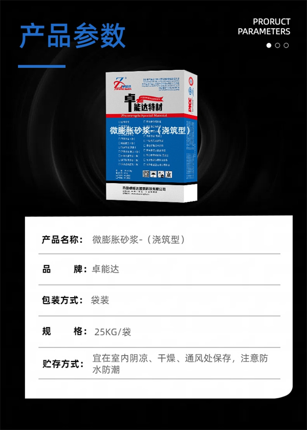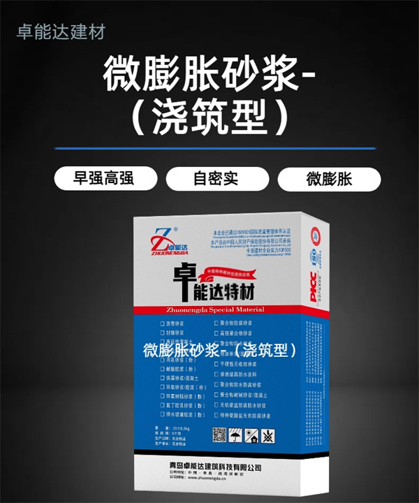 微膨胀砂浆是以高强石英砂作为骨料,以水泥作为结合剂,辅以高流态、微膨胀、防离析等物质配制而成。施工现场加入适量的水,搅拌均匀后即可使用。具有自流性好、早强、高强、无收缩、微膨胀、自密性好、防锈等特点。能改变设备底座受力情况,使之均匀地承受设备的荷载,从而满足各种大型机械设备或其他灌浆场景的设计要求。